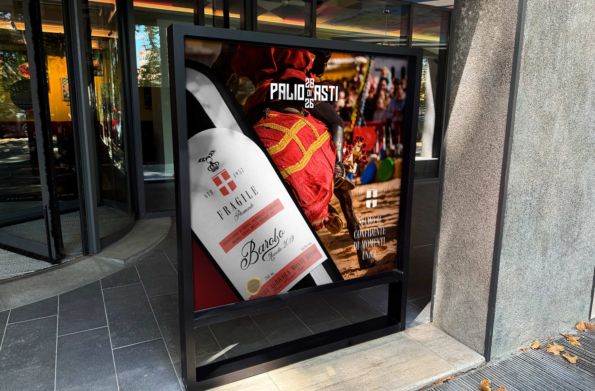 La referencia al Palio di Asti se refleja en el escudo y en la simbología de la tradición ecuestre, asociando el vino a celebraciones memorables y a la pasión cultural de la región.