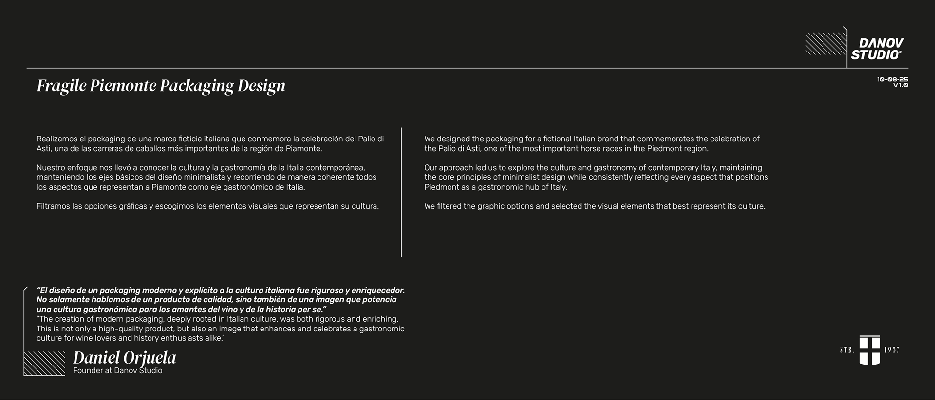 El proyecto de diseño para Fragile busca encapsular en una sola pieza gráfica la herencia, elegancia y calidez de la región del Alto Monferrato, en el corazón del Piamonte. Inspirada por la arquitectura histórica que combina elementos románicos, góticos, renacentistas, barrocos y neoclásicos, la etiqueta fusiona tradición y minimalismo para lograr un balance entre sobriedad y sofisticación.