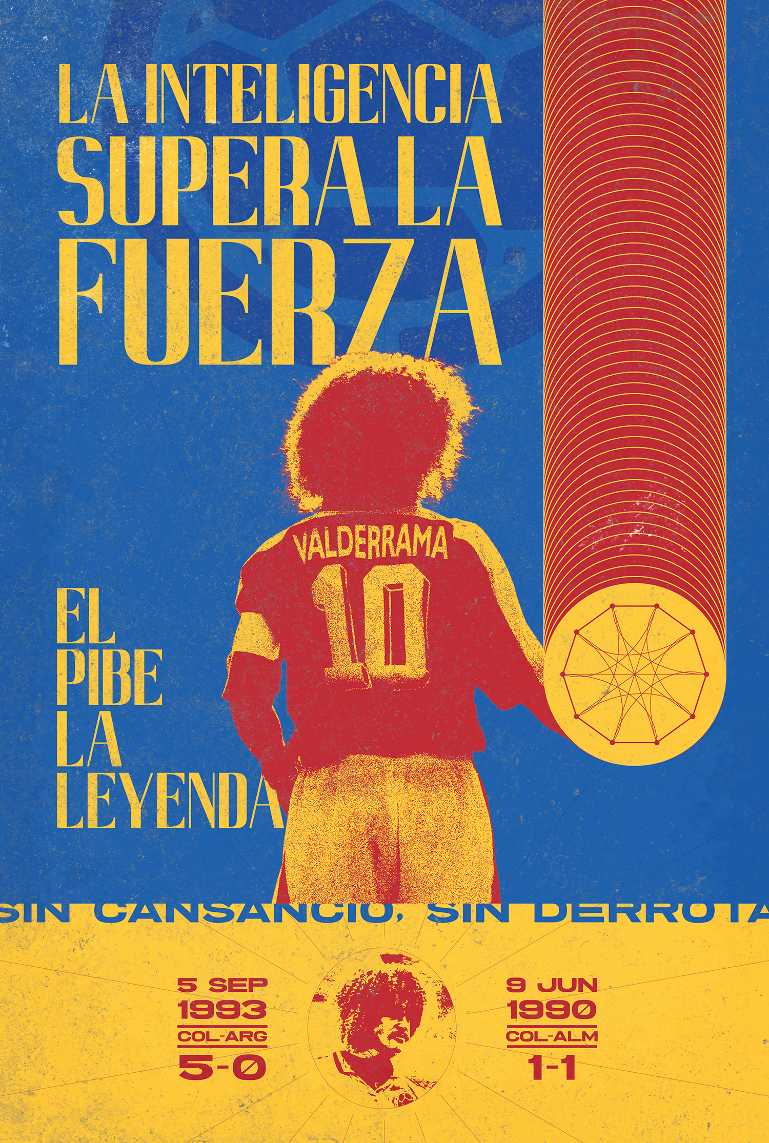 Además de rendir homenaje a la figura de Carlos “El Pibe” Valderrama, este póster busca resaltar el contexto histórico y emocional en el que se desarrolló su carrera. Por eso, se incorporan referencias gráficas y cromáticas que evocan los años 90: una paleta vibrante de azules, amarillos y rojos, símbolos directos de la bandera colombiana, y un estilo visual de acabado retro y texturizado, que remite a los carteles deportivos de la época.