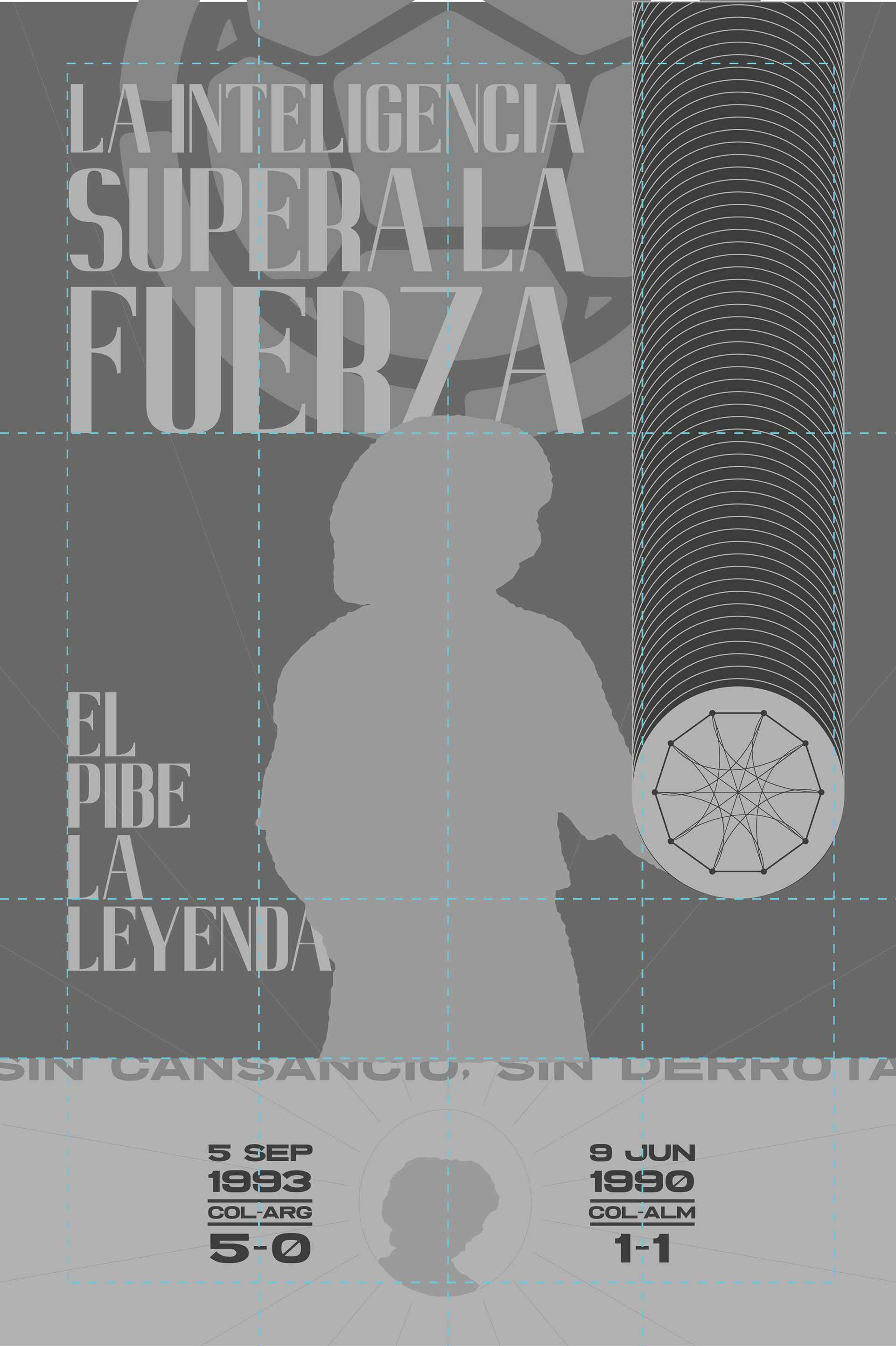 La tipografía en bloque y de gran peso visual transmite fuerza y carácter, mientras que el contraste con la silueta del jugador genera un equilibrio entre lo monumental y lo íntimo.