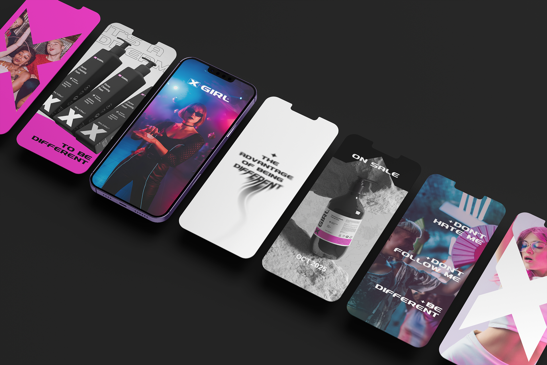 This branding project emerges from an intimate perspective: the emotional and aesthetic observation of a young woman who found in electronic music and the subversion of social codes a form of catharsis and personal expression. X GIRL is, therefore, the symbolic embodiment of that universe; dark, intense, emotional, and deeply authentic.