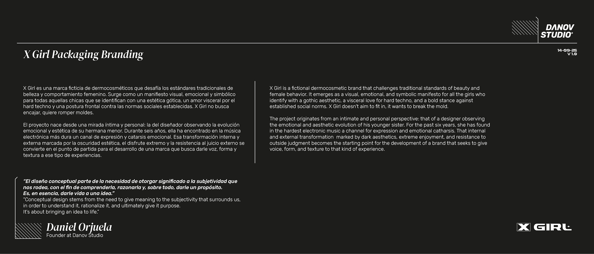 Este proyecto de branding nace desde una perspectiva íntima: la observación emocional y estética de una joven que encontró en la música electrónica y la subversión de códigos sociales una forma de catarsis y expresión personal. X GIRL es, por tanto, la materialización simbólica de ese universo: oscuro, potente, emocional y profundamente auténtico.